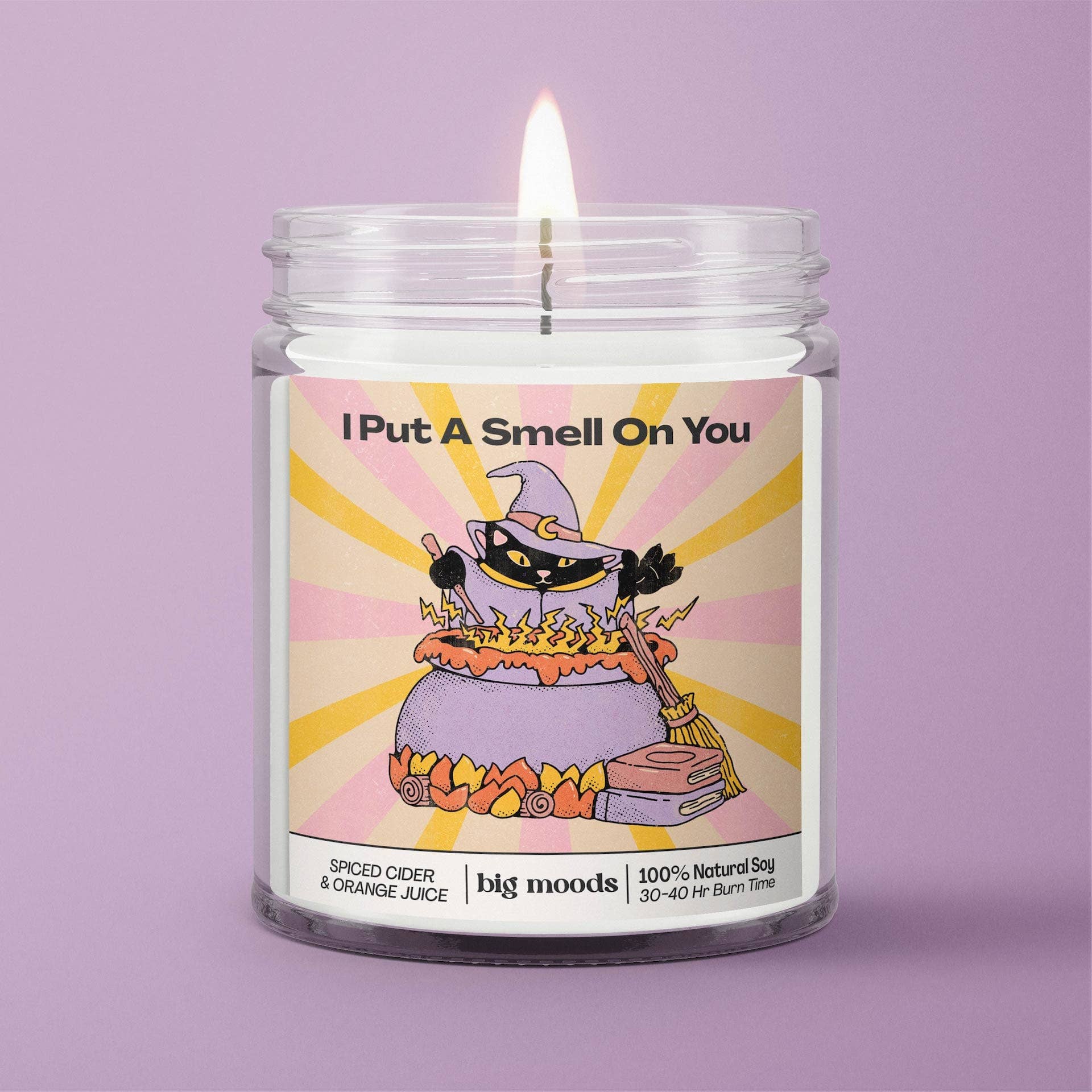 This unique design and smell is inspired by spiced fall scents and cozy drinks. Infused with the aromatic notes of fresh orange juice, whole cloves, and spiced apple cider, this fragrance encapsulates the essence of festive gatherings and cozy winter nights. This fun, vibrant, and witchy cat design is a must have for all those who love witch and mystical vibes.